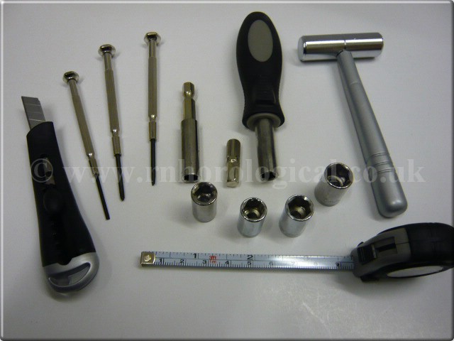 Tool Kit with Short Hammer, 3 Screwdrivers, Craft Knife, Tape Measure and 4 pc Socket Set Sizes: 7, 8, 9 & 10mm