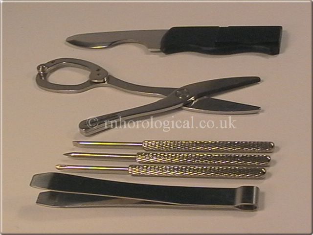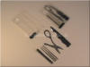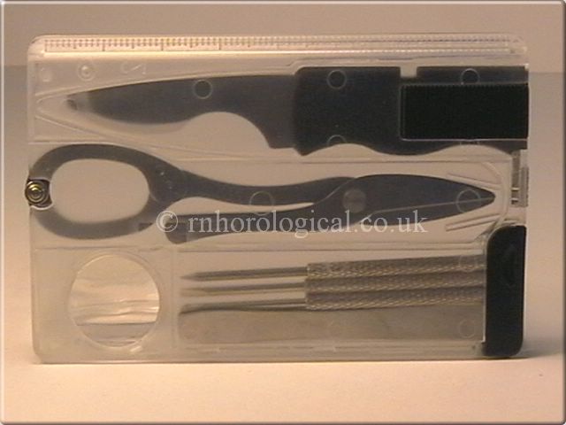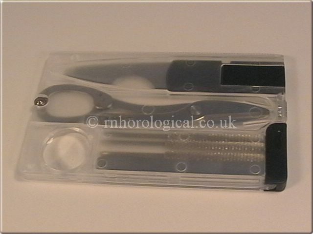 T-S 758 Pocket (Credit card size) watchmakers and hobbyists kit including : Knife, wide tweezers, scissors, ruler, magnifier and 3 screwdrivers. |